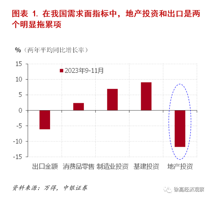 至于五常先生讲的房地产低迷抑制消费的逻辑,在中国经济现实中虽然成立,却不是经济下行压力的主要来源。当前,地产低迷给中国经济带来的直接压力,远大于抑制消费带来的间接影响。过去两年,中国地产投资金额年平均下降10%还多,是中国内需的最大拖累。相比之下,反映中国消费的社会消费品零售总额,仍保持了正增长。这两年来,中国消费虽然说不上有多强,但绝不是经济下行压力的主要来源。因此,当前稳增长的关键在于稳地产投资,而非刺激消费。事实上,中国地产行业如果能显著改善,消费将随经济预期的修复而相应改善。(图表1)