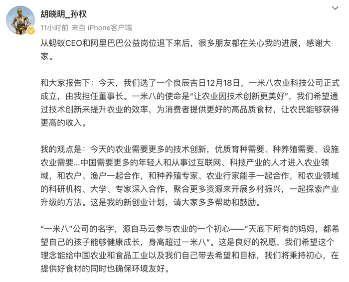 12月18日,前阿里合伙人、前蚂蚁集团CEO胡晓明(花名:孙权)发布微博称,一米八农业科技公司正式成立,由他担任董事长兼首席品控官。