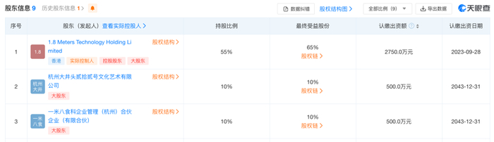 天眼查信息显示,已有多个“一米八”相关的公司成立。其中,2023年7月,一米八海洋科技(浙江)有限公司在杭州成立,注册资本达1.1亿元,胡晓明担任该公司董事长。