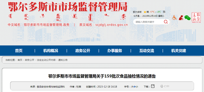 内蒙古鄂尔多斯市市场监督管理局关于159批次食品抽检情况的通告