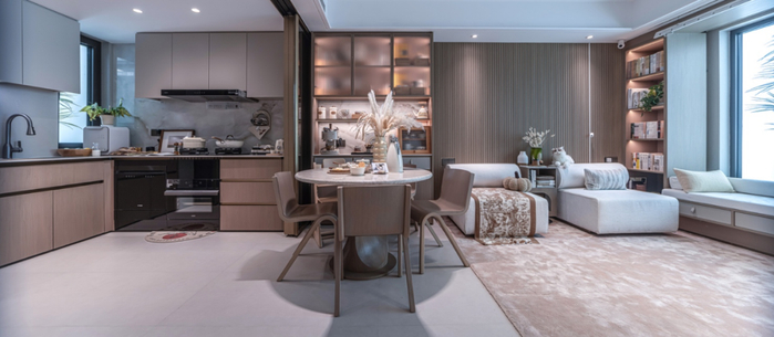 首先,全屋装修一步到位,通过预见居住者未来生活场景,项目配置功能完备的家电,挥手感应烟机、防干烧猛火灶、嵌入式洗碗机、智能扫拖机器人、全智能马桶等一应俱全,打造拎包即享的入住体验。