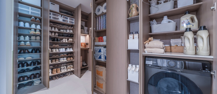 其次,颠覆传统装修产品模式,以“功能场景设计先行,户型空间设计后置”的原则,先根据生活需求设计收纳、家电方案,再根据收纳和电器方案设计户型,以减少空间浪费。约18组柜体,约27.1m³收纳空间,满足一家人的收纳需求。