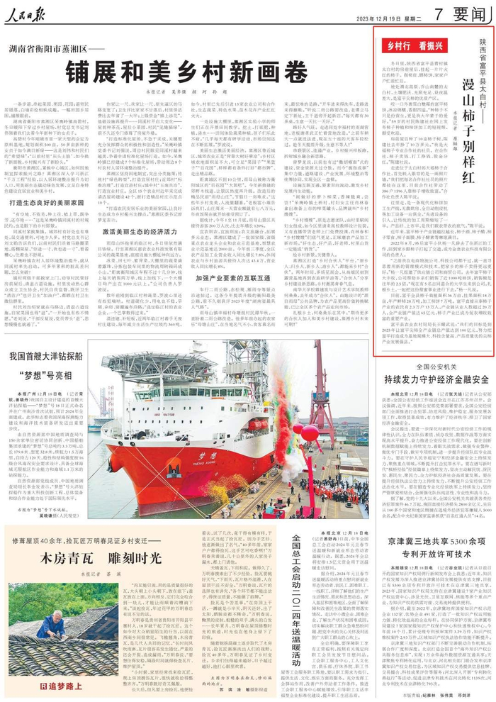 “之前我在电商物流公司、科技公司都干过,就一直寻思着用新的管理模式和技术,把家乡的柿子卖得更远更好。”杨一凡组建了供应链公司和商贸公司。去年富平柿子大丰收,公司帮助乡亲们销售了近1000吨柿饼,销售额是往年的2.5倍。“现在有5名志同道合的大学生来到公司,扎根乡土,一起把这份甜蜜事业进行下去。”杨一凡说。