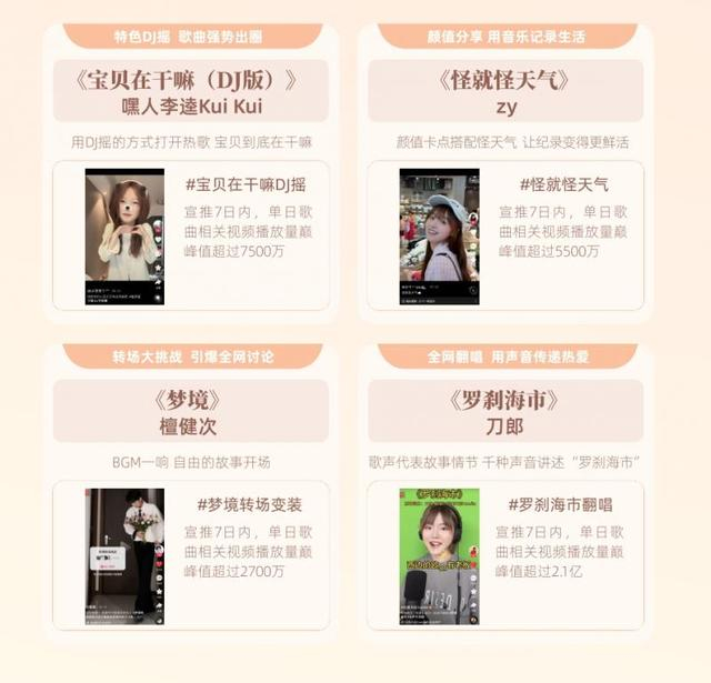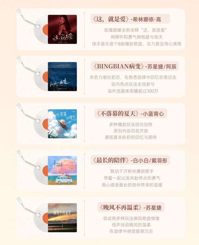 快手音乐还大力投入音乐分区banner、热门活动banner、快手热歌榜单、风格榜单、音乐阿拉丁、话题聚合等重量级官方宣推资源矩阵,并与音乐人一起探索联合宣推新模式,爱豆希林娜依·高的《这,就是爱》,成为快手音乐首个B级爆款歌曲;苏星婕、阿辰的《BINGBIAN病变》也通过站内热点玩法吸引全民参与,站外流媒体周播超过300万;小蓝背心的《不落幕的夏天》、白小白、戴羽彤的《最长的陪伴》,以及苏星婕的《晚风不再温柔》也在多种爆款玩法综合加持下,实现了原创内容的百花齐放,助力爆款歌曲迅速出圈。