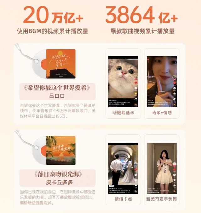 快手平台上广大的音乐使用人群,也让更多好音乐被人们所“听见”“看见”。2023年,快手平台使用BGM的视频累计播放量已超过20万亿,爆款歌曲视频累计播放量近4000亿。其中,吕口口的《希望你被这个世界爱着》成为了快手音乐首个现象级行业爆款歌曲,流媒体单平台日播超过155万,常常出现在各种萌宠短视频、情感短视频中;而皮卡丘多多的《落日亲吻银光海》,以强烈的律动、温暖的力量,通过情侣卡点、甜美可爱手势舞等霸榜玩法强势刷屏,并“造就”了多个超百万播放的爆款视频。