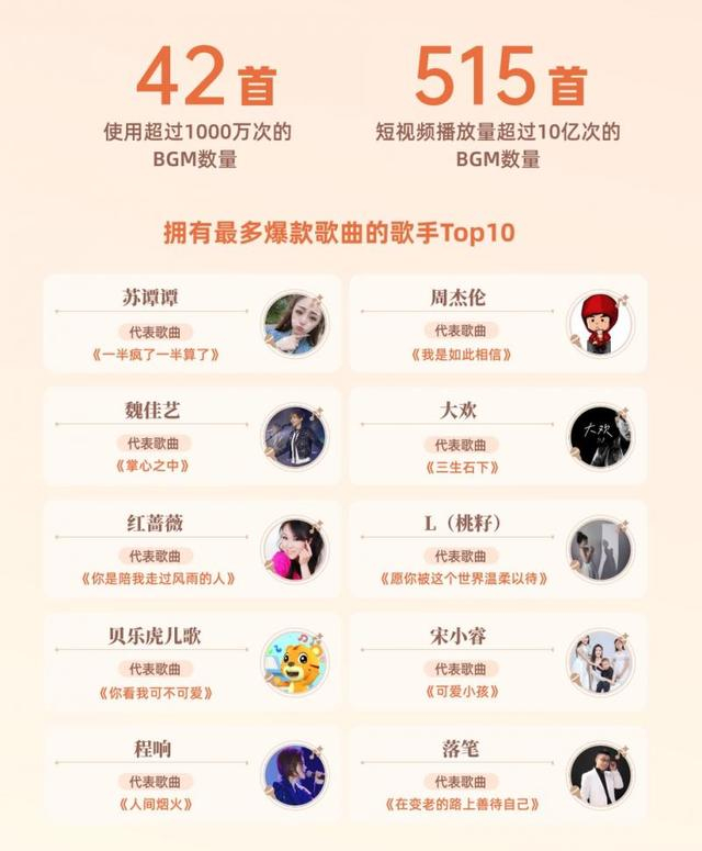 同时,海量的爆款歌曲,还引领了2023年的音乐潮流风向。报告显示,今年被使用超过1000万次的BGM有42首;短视频播放量超过10亿次的BGM有515首。而周杰伦、苏谭谭、魏佳艺、大欢、红蔷薇、L(桃籽)、贝乐虎儿歌、宋小睿、程响、落笔成为了拥有最多爆款歌曲的歌手。