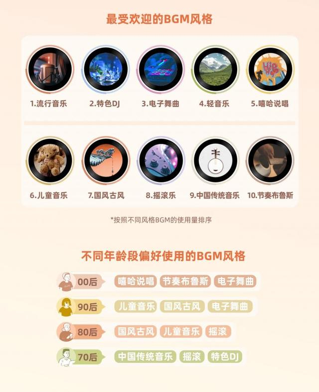 在音乐风格和音乐受众方面,快手用户在音乐审美表达上呈现出多元化的繁荣景象,流行音乐、特色DJ、电子舞曲、轻音乐、嘻哈说唱、儿童音乐、国风古风、摇滚乐、中国传统音乐、节奏布鲁斯等音乐风格成为BGM欢迎度TOP10;大家热衷于使用BGM表达动感、快乐、伤感、思念、浪漫、治愈、抒情、甜蜜、励志、可爱等情绪。