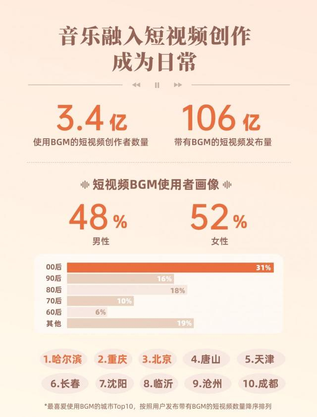 在快手,音乐融入短视频创作已经成为了一种日常,而音乐也让短视频的表达变得更加丰富。报告显示,2023年,有3.4亿位不同领域的创作者,发布了106亿条带有BGM的短视频。在短视频 BGM使用者中,男性占比48%,女性占比52%;从年龄结构来看,以00后人群为主,占比达31%;哈尔滨、重庆、北京、唐山、天津、长春、沈阳、临沂、沧州、成都等十座城市的用户尤其喜爱使用BGM进行短视频创作。