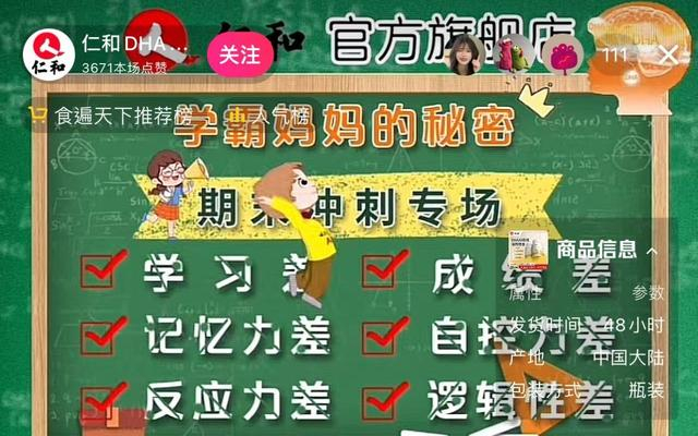 在仁和DHA核桃油官方直播中,直播间的背景上赫然写着“开学季,学霸妈妈的秘密。学习差、成绩差、记忆力差、自控力差、反应力差、逻辑性差”,主播每天不间断直播介绍DHA产品。