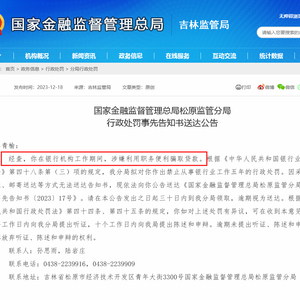 12月18日,国家金融监督管理总局松原监管分局在文书中指出,经查,单青榆在银行机构工作期间,涉嫌利用职务便利骗取贷款。根据《中华人民共和国银行业监督管理法》第四十八条第(三)项的规定,我分局拟对你作出禁止从事银行业工作五年的行政处罚。因采取直接送达、邮寄送达等方式无法送达告知书,现依法向你公告送达《国家金融监督管理总局松原监管分局行政处罚事先告知书〔2023〕17号》。请在本公告发出之日起三十日内到我分局领取,逾期视为送达。