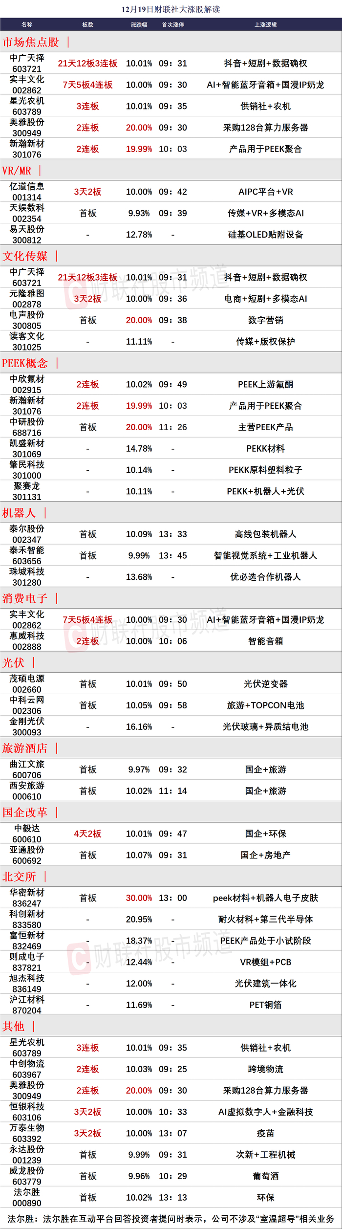 财联社12月19日讯,今日27股涨停,19股炸板,封板率为59%,实丰文化7天5板,中广天择、星光农机3连板,奥雅股份、新瀚新材20CM2连板,中创物流、中欣氟材、惠威科技2连板,恒银科技、亿道信息12天5板,万泰生物、元隆雅图3天2板,中毅达4天2板,中研股份、电声股份20CM首板,北交所华密新材30CM首板。盘面上,两市超2600家个股上涨;板块方面,MR、旅游、消费电子、自动化设备等板块涨幅居前,物流、贸易、房地产、中药等板块跌幅居前。