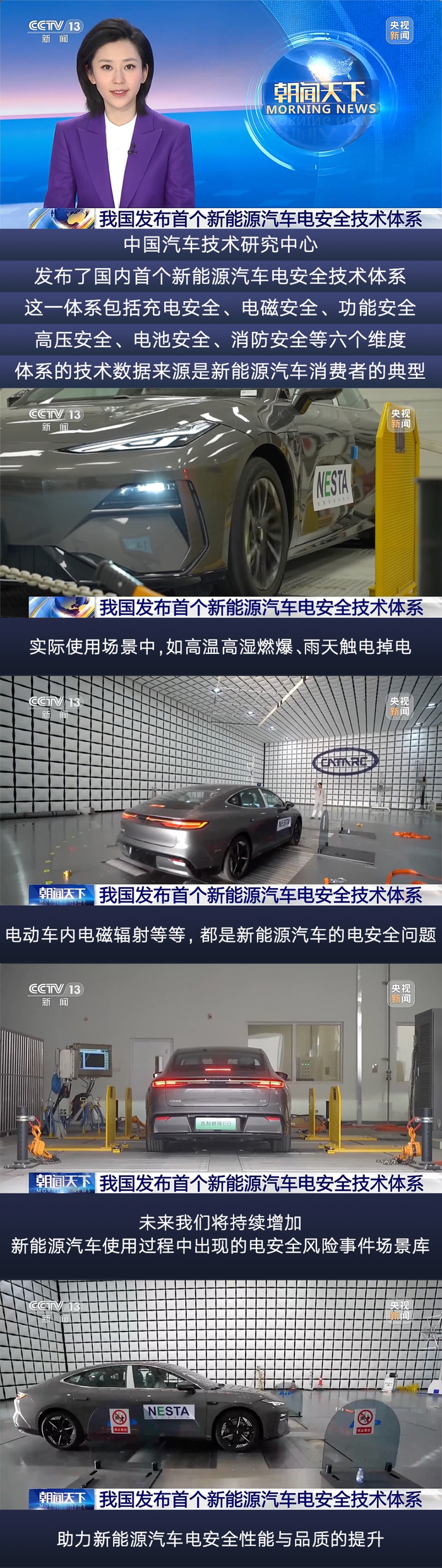 据央视报道,国内首个“新能源汽车电安全技术评价体系认证”由中汽中心发布,包括充电安全、电磁安全、功能安全、高压安全、电池安全、消防安全等6个维度,涵盖16项认证共1000多项测试。该体系认证的测试项目可覆盖新能源汽车绝大多数使用场景,比如夏天高温高湿环境下,大功率充电车辆会不会出现自燃?行车过程中,车辆会不会高压意外掉电?电动车内,电磁辐射会不会对身体健康产生伤害等等。