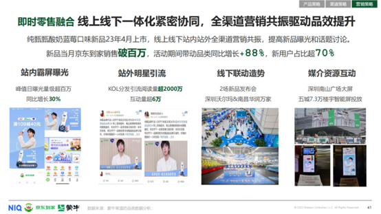 对乳品企业而言,要想实现新品即爆品,需要全渠道协同发力,驱动品效提升。比如2023年4月,蒙牛纯甄酸奶蓝莓口味新品上市活动中,与京东到家合作纯甄超级品牌日活动,通过“站内霸屏曝光”、“站外明星引流”、“线下联动造势”、“媒介资源互动”四大举措,实现线上线下全渠道营销共振,提高新品曝光和话题讨论,纯甄新品甄酸奶蓝莓当月在京东到家销售破百万,活动期间带动品类同比增长88%,新用户占比超70%,有效缩短新品到爆品的路径。