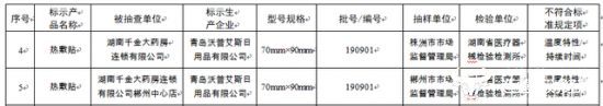 2021年2月3日,湖南省药品监督管理局发布一则关于2020年医疗器械抽检质量公告(2021年 第5号),其中,标识被抽查单位为湖南千金大药房连锁有限公司、湖南千金大药房连锁有限公司郴州中心店销售份的“热敷贴”不合格。涉及产品批号/编号为“19091”,不符合标准规定项为“温度特性/持续时间”。但该产品的生产企业为青岛沃着艾斯日用品有限公司。