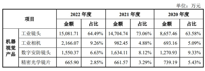 公司自主研发的工业镜头可以达到超小的画面畸变、超高解像力、超大靶面等特性,能够满足超大视场角、超高精度、超短焦距、移轴及不同波长光线的适用要求,广泛应用于新能源、半导体、光伏、显示面板、3C 电子、汽车、食品医药等众多重要工业领域,终端应用客户包括比亚迪、宁德时代、芯碁微装、先导智能、智洋创新、中科微至、博众精工、精测电子等知名企业。