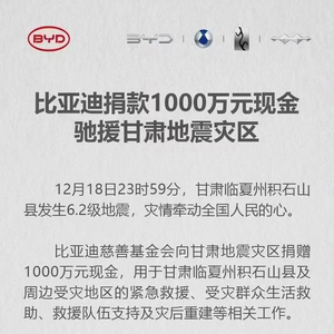 比亚迪慈善基金会向甘肃地震灾区捐赠1000万元现金,用于地震灾区的紧急救援、受灾群众生活救助、救援队伍支持及灾后重建等相关工作。