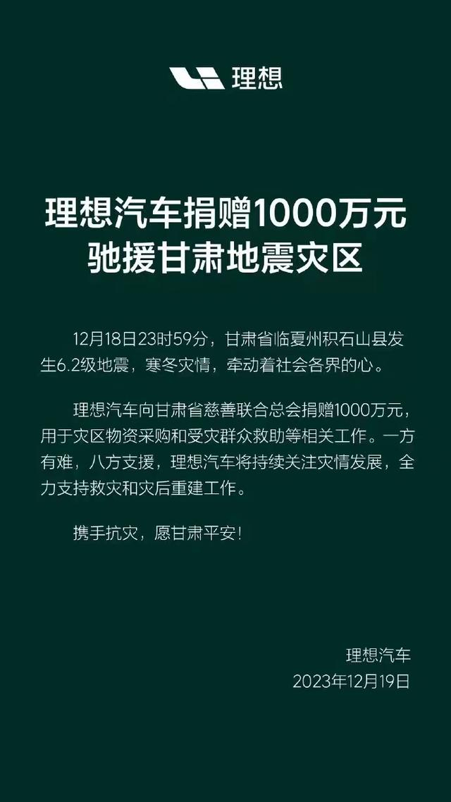 理想汽车向甘肃省慈善联合总会捐赠1000万元,用于灾区物资采购和受灾群众救助等相关工作。