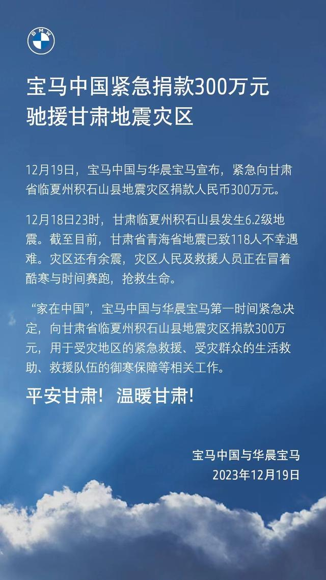 宝马中国与华晨宝马宣布,紧急向甘肃省临夏州积石山县地震灾区捐款人民币300万元,用于受灾地区的紧急救援、受灾群众的生活救助、救援队伍的御寒保障等相关工作。