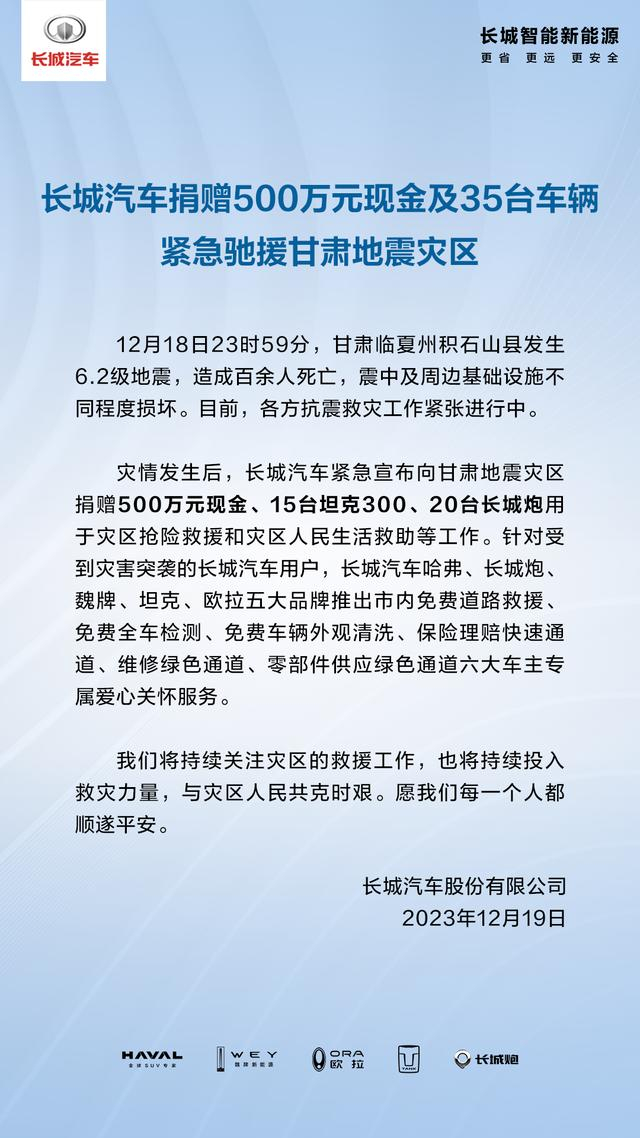 长城汽车紧急宣布向甘肃地震灾区捐赠 500 万元现金、15 台坦克 300、20 台长城炮用于灾区抢险救援和灾区人民生活救助等工作。针对受到灾害突袭的长城汽车用户,长城汽车哈弗、长城炮、魏牌、坦克、欧拉五大品牌推出市内免费道路救援、免费全车检测、免费车辆外观清洗、保险理赔快速通道、维修绿色通道、零部件供应绿色通道六大车主专属爱心关怀服务。