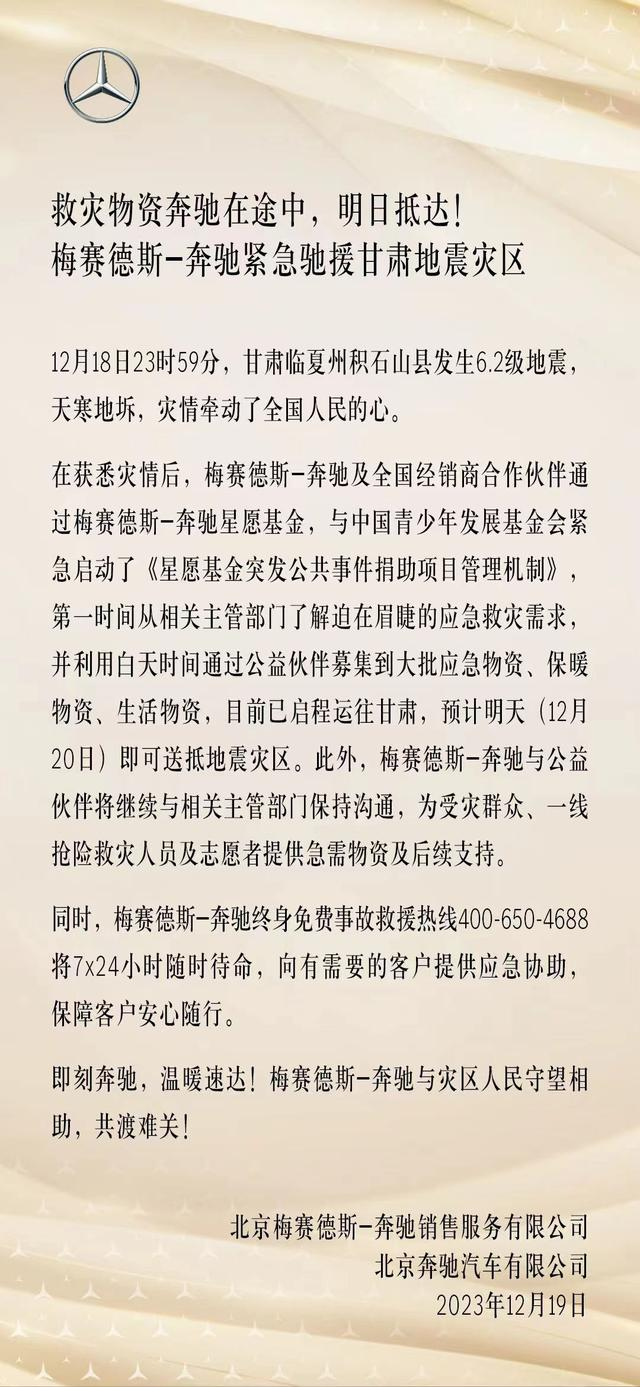 梅赛德斯-奔驰及全国经销商合作伙伴通过梅赛德斯-奔驰星愿基金,与中国青少年发展基金会紧急启动了《星愿基金突发公共事件捐助项目管理机制》,利用白天时间通过公益伙伴募集到大批应急物资、保暖物资、生活物资,目前已启程运往甘肃,预计明天(12月20日)即可送抵地震灾区。