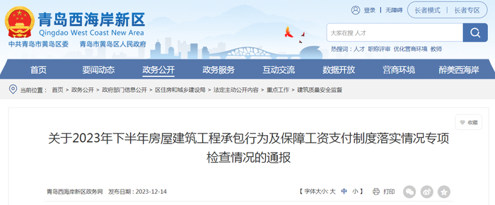 青岛西海岸新区住房和城乡建设局关于2023年下半年房屋建筑工程承包行为及保障工资支付制度落实情况专项检查情况的通报
