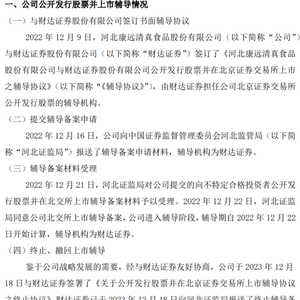 与财达证券股份有限公司签订书面辅导协议:2022年12月9日,河北康远清真食品股份有限公司(以下简称“公司”)与财达证券股份有限公司(以下简称“财达证券”)签订了《河北康远清真食品股份有限公司与财达证券股份有限公司公开发行股票并在北京证券交易所上市之辅导协议》(以下简称“《辅导协议》”),由财达证券担任公司北京证券交易所公开发行股票的辅导机构。