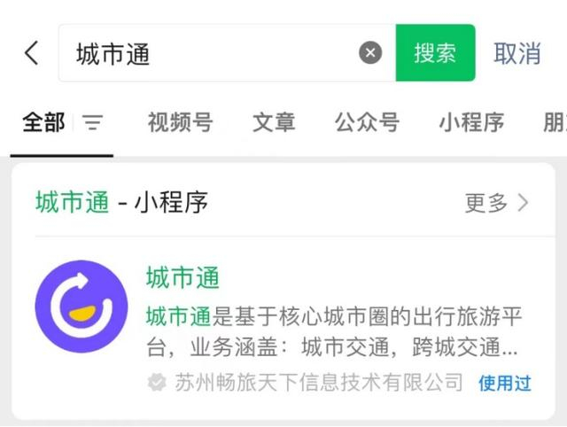 1.微信App首页搜索“城市通”小程序;