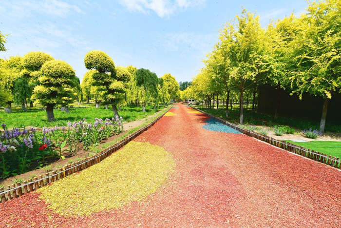 西集盛世嘉禾园林基地用园林废弃物制成的彩色有机覆盖物铺设园道。