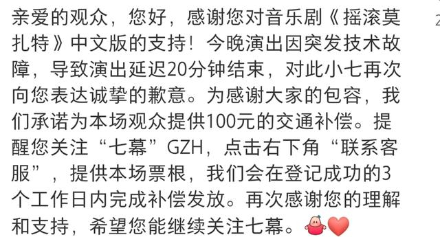 12月15日,《摇滚莫扎特》在北京演出遭遇音响故障,演出延迟20分钟;最终剧组为观众提供了100元交通补偿。