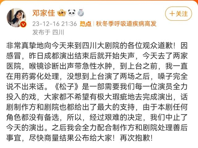 无独有偶,12月16日,演员邓家佳领衔主演话剧《被嫌弃的松子的一生》亮相四川大剧院,观众刚坐下十分钟,演出就结束了。当晚邓家佳通过微博表示道歉,因病失声,不得不中止当晚演出,并表示将全力配合制作方和剧院处理善后事宜。