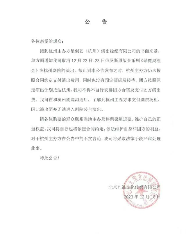 12月18日晚,俄罗斯LDM剧院音乐剧《恶魔奥涅金》宣布取消12月22日—23日杭州演出,为观众办理退票。实际上该剧演员都已经到达杭州,但主办方没有支付相关费用,无法按时演出。
