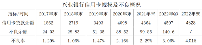 截至2017年末、2018年末、2019年末、2020年末和2021年末,兴业银行信用卡不良率分别为1.29%、1.06%、1.47%、2.16%、2.29%,反映出兴业银行信用卡不良风险开始爆发。