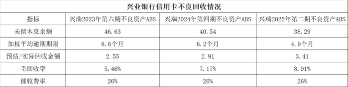 新经济IPO注意到,兴业银行信用卡不良资产回收情况较差。以兴瑞2023年第六期不良资产ABS为例,毛回收率仅5.46%,46.63亿元的信用卡不良资产,预估回收金额仅2.55亿元,但其催收费率竟然高达26%。兴瑞2023年第四期不良资产ABS,底层资产金额40.54亿元,加权平均逾期期限6.2个月,回收金额约2.91亿元,毛回收率7.17%,催收费率同样为26%;兴瑞2023年第二期不良资产ABS,不良资产包38.29亿元,加权平均逾期期限4.9个月,回收金额3.4亿元,毛回收率8.91%,催收费率同样为26%。