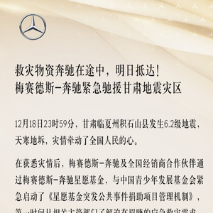 12月19日,在获悉灾情后,梅赛德斯-奔驰及全国经销商合作伙伴通过梅赛德斯-奔驰星愿基金,与中国青少年发展基金会紧急启动了《星愿基金突发公共事件捐助项目管理机制》,第一时间从相关主管部门了解迫在眉睫的应急救灾需求并利用白天时间通过公益伙伴募集到大批应急物资、保暖物资、生活物资,目前已启程运往甘肃,预计12月20日即可送抵地震灾区。