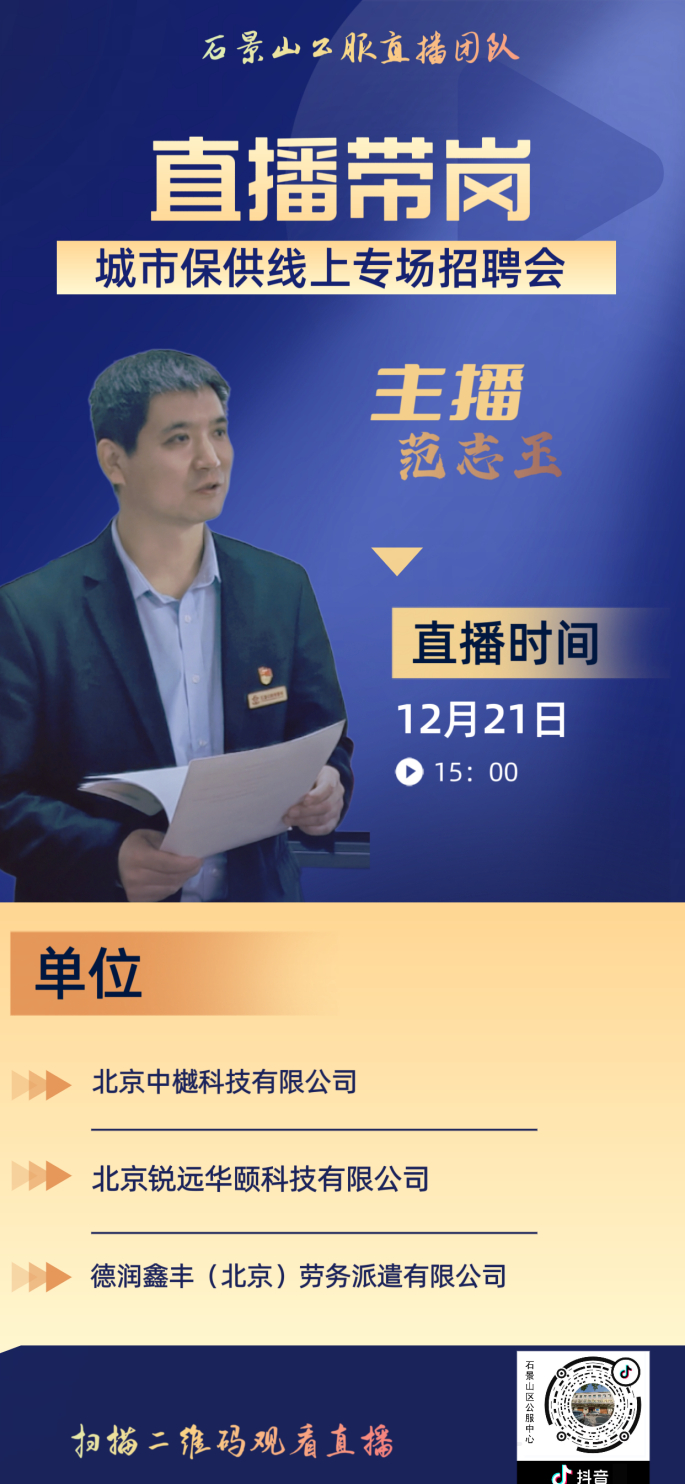 12月21日下午15:00,城市“保供”专场招聘直播带岗活动,助力企业在“两节”前,精准快速的招聘到所需人员。
