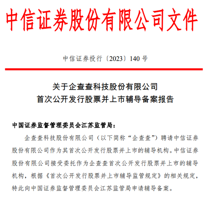 中信证券接受委托作为企查查首次公开发行股票并上市的辅导机构,向江苏证监局申请辅导备案。辅导协议签署时间为2023年12月12日。