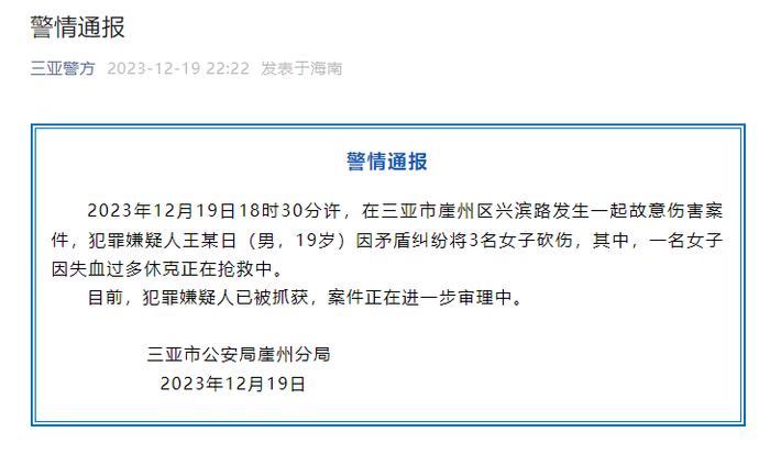 通报称,2023年12月19日18时30分许,在三亚市崖州区兴滨路发生一起故意伤害案件,犯罪嫌疑人王某日(男,19岁)因矛盾纠纷将3名女子砍伤,其中,一名女子因失血过多休克正在抢救中。