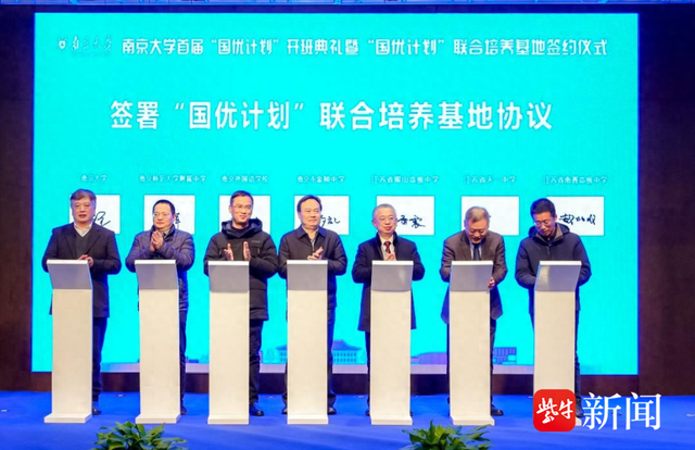 仪式上,南京大学与南京师范大学附属中学、江苏省天一中学、江苏省海安高级中学等26所知名中学签署“国优计划”联合培养基地协议。根据协议,南京大学将与省内各高中名校紧密围绕“国优计划”的人才培养工作,在师资共享、教育教学实习实践、科研课题申报、讲座研讨交流等领域开展合作。