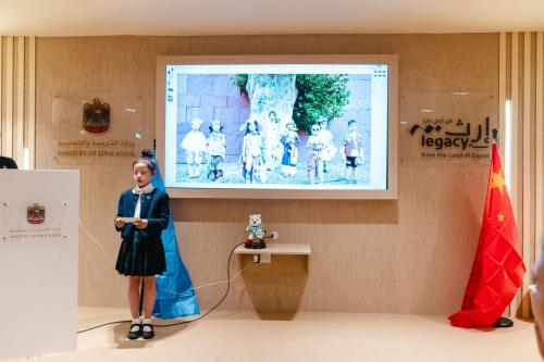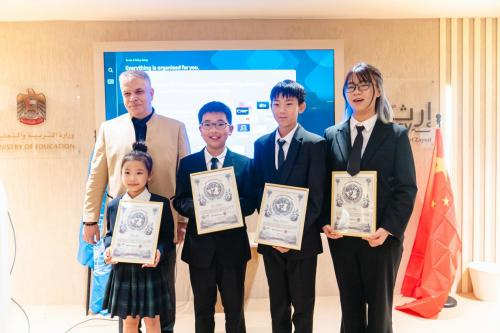 陈泊凡同学的演讲“学生少写作业如何推进双碳进程”,不仅提出了教育与环保相结合的新思路,而且深入探讨了教育系统在实现碳中和目标中的潜在作用。常顺天同学以“以杭州亚运会为例的低碳实践研究”为题,分享了城市大型活动如何结合低碳实践,为可持续发展提供切实案例。最令人印象深刻的是应越同学的“Save Clothes Save Earth”,这一演讲不仅在场内引起了极大的反响,更是引发了全场的热烈讨论。她的演讲聚焦于服装行业在环境保护中的角色,以及个人如何通过改变日常行为为地球的未来作出贡献。迪拜妇女儿童最高委员会的主席更是直接向绿山青年代表发出合作邀请,希望能共同推进在环保领域的发展。
