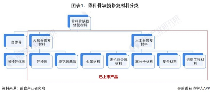骨科骨缺损修复材料按材料来源,可分为自体骨、天然骨修复材料、人工骨修复材料三大类,其中我国已上市的产品包括天然骨修复材料和人工骨修复材料两大类。天然骨修复材料又包括同种异体骨、异种骨和脱钙骨基质。人工骨修复材料又包括金属材料、无机非金属材料、高分子材料、复合材料和组织工程材料等不同类型产品。