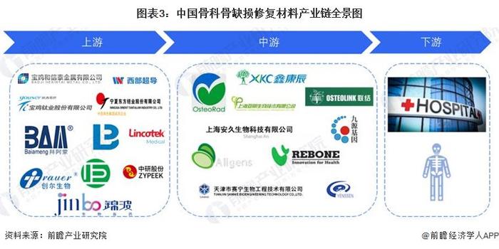 骨科骨缺损修复材料产业链包括上游医用金属材料、无机非金属材料、高分子材料等原材料供应,中游为骨科骨缺损修复材料制造,下游为流通应用环节。
