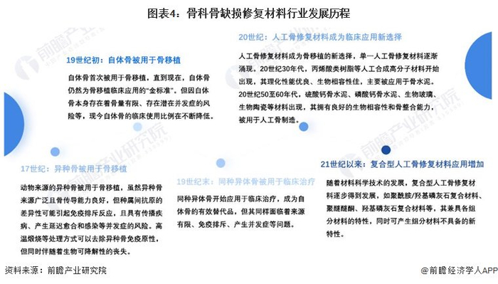 骨科骨缺损修复材料行业的发展历程以其材料来源为脉络,从17世纪异种骨首次被用于骨移植开始,经历了异种骨、自体骨、同种异体骨、人工骨修复材料的演变过程,人工骨修复材料的原材料也在逐渐演变,进入21世纪复合人工骨修复材料得到越来越多的应用。
