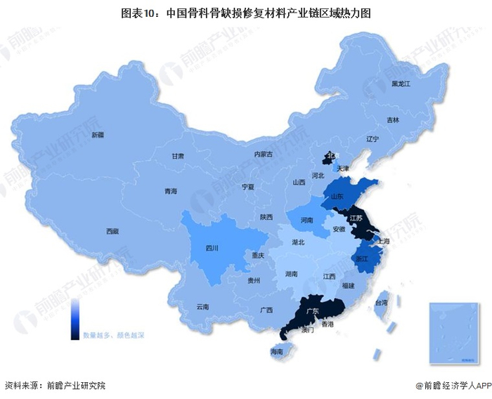 从我国骨科骨缺损修复材料产业链企业区域分布来看,骨科骨缺损修复材料产业链企业主要分布在广东、江苏、北京、上海、山东、浙江等地。