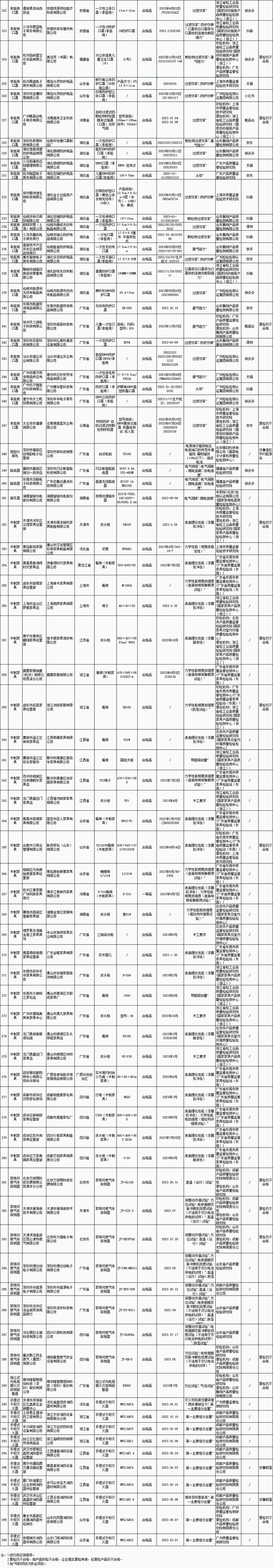 (一)监督抽查概况。共抽查检验2544家生产单位、1113家销售单位的2651批次产品,发现不合格产品299批次。在不合格产品中,电动自行车45批次、安全帽5批次、安全带3批次、安全网2批次、保护足趾安全(防护)鞋4批次、儿童家具25批次、橡胶密封制品8批次、电动工具(锂电电钻)16批次、机动脱粒机2批次、非接触式水嘴4批次、陶瓷片密封水嘴5批次、建筑用密封胶5批次、浸渍纸层压木质地板2批次、陶瓷坐便器26批次、智能坐便器7批次、陶瓷砖7批次、危险化学品包装物4批次、床上用品16批次、休闲服装16批次、非医用口罩45批次、微型计算机1批次、路由器2批次、服务器1批次、木制家具29批次、家用可燃气体探测器8批次、独立式光电感烟火灾探测报警器1批次、手提式干粉灭火器10批次(见附件1)。