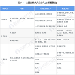 轻医美项目主要包括光电类项目和注射类项目,由于注射类项目见效快、操作时间短,大大降低了消费者的时间成本,因此近年来注射类医美项目快速发展。从材料性质来看,注射类医美项目所用到的材料主要包括填充材料、补充材料、支撑材料、萎缩材料四大类。其中,应用较为广泛的是以玻尿酸为代表的填充材料和以刺激胶原蛋白再生的少女针、童颜针等。具体分类及功能、成分、注射层次等信息如下表所示: