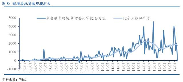 委托贷款作为通道自10年规模逐渐扩大。截止17年4月委托贷款规模13.82万亿元。新增委贷规模自10年开始规模逐渐提高,并且月度新增量波动也逐渐加大。委托贷款在通道业务中通常不会作为第一层通道。