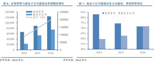 截止2016年末,券商资管与基金子公司中通道业务规模为19.84万亿元。其中券商资管占比较高,规模为12.4亿元;资金子公司为7.5亿元。通道业务的规模在过去两年里加权增速达50%。基金子公司在过去受益于没有净资本约束,在费率上更有优势,规模扩大更快。16年末通道业务占比为71.7%,与14年相比提高了12.1个百分点。券商资管的通道业务占比在过去两年则逐步下降,与14年相比16年末通道业务占比降低了11.5个百分点。