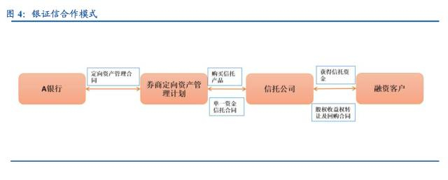 银证信合作模式:由于银信合作业务受净资本约束或投资资产的限制,往往在银行与信托之间通过一道券商设立的定向资管计划,银行理财购买资管计划,再通过资管计划认购信托产品。