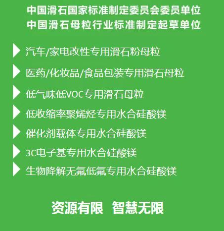 水合硅酸镁母粒是一种塑料改性填料,它以水合硅酸镁为主要成分,通过与聚合物或其他载体混合造粒而形成的颗粒填料。主要应用于塑料、橡胶等树脂的性能改良。与水合硅酸镁相比,水合硅酸镁母粒具有良好的运输与加工性能,同时改善了水合硅酸镁的分散及环保。