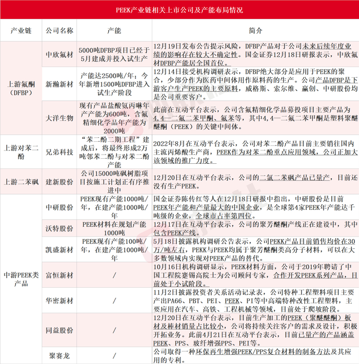 据财联社不完全梳理,PEEK产业上游原材料主要包括氟酮(DFBP)、对苯二酚、二苯砜和磷酸钠等细分领域,其中氟酮是合成PEEK最关键的原材料;中游涵盖PEEK类产品智造领域。涉及A股上市公司包括中欣氟材、新瀚新材、大洋生物、兄弟科技、建新股份、中研股份、沃特股份、凯盛新材、富恒新材、华密新材、同益股份和聚赛龙,具体产能及相关情况如下表: